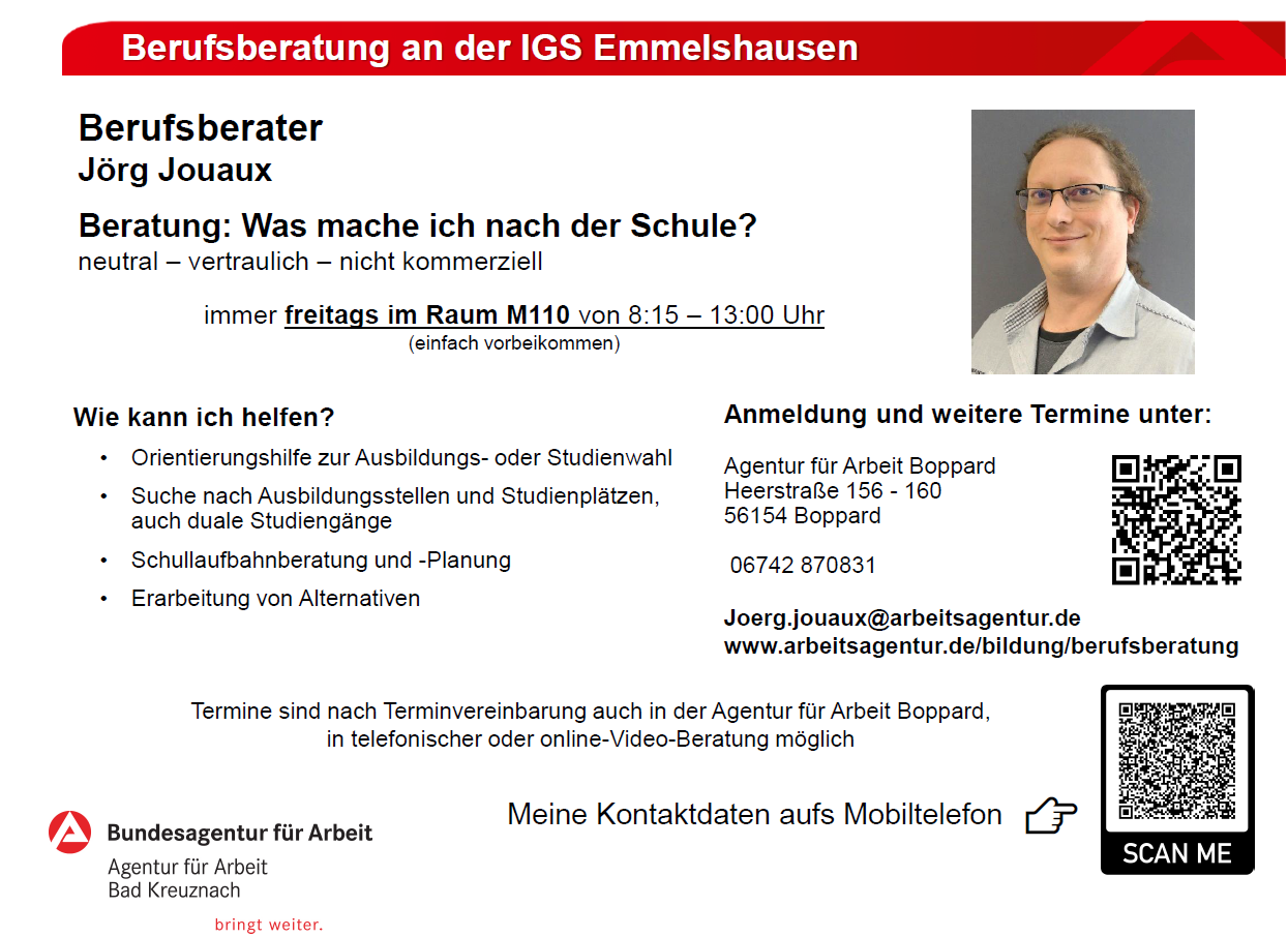 Berufsorientierung Unterlagen für das Betriebspraktikum Hier finden Sie alle wichtigen Unterlagen für das Betriebspraktikum Präsentation Anschreiben für Betriebe Klasse 9 Anschreiben für Betriebe Klasse 8 Anschreiben für Eltern Klasse 9 Anschreiben für Eltern Klasse 8 Praktikumsbeurteilung Jörg Jouaux Bundesagentur für Arbeit 06742 870831 joerg.jouaux@arbeitsagentur.de Mehr Informationen Anmeldebogen Britta Fromme Jobfux 0160 929 90835 jobfux@mrso.de Mehr Informationen Weitere Informationen zum Jobfux - Projekt Partnerfirmen